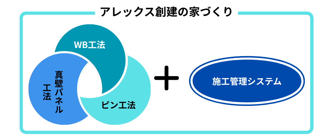 アレックス創建では、ご家族の安全を守るために「耐震性能」を重視しています。採用しているのは、力を分散する高耐震構造「真壁パネル工法」と、柱や梁の断面欠損を抑えて強度を高める「ピン工法」の組み合わせです。