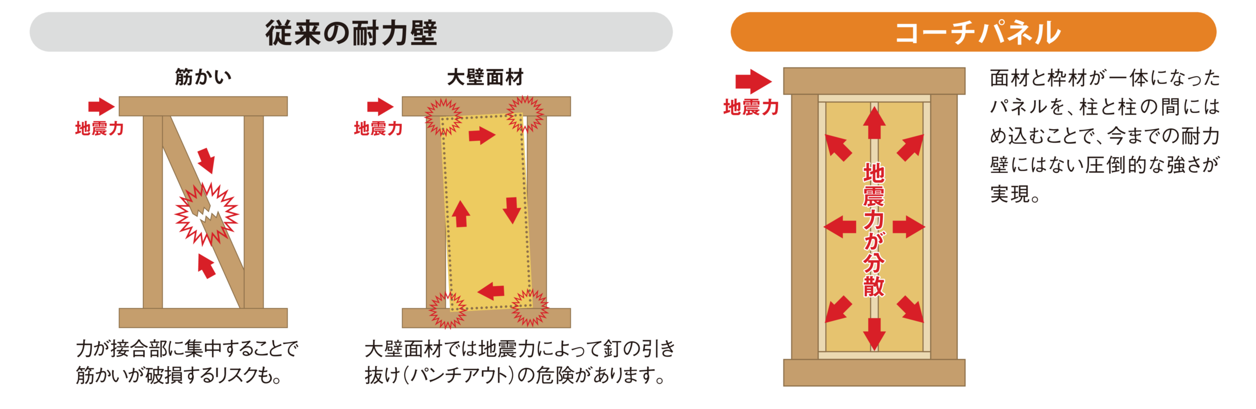 真壁パネル工法は、壁全体で力を受け止めるモノコック構造により、地震の揺れを建物全体に分散。ねじれや変形を抑え、倒壊リスクを軽減します。