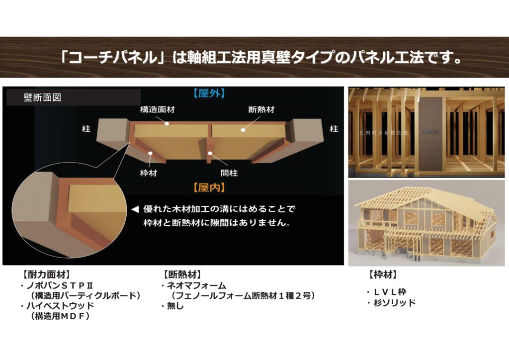 この真壁パネルは柱と梁が見えるように、耐力壁を柱の間に納める仕様となっていて、