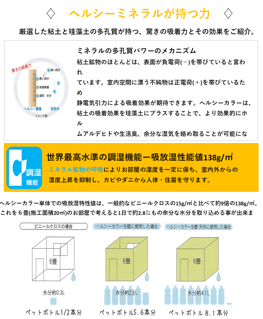 珊瑚やゼオライトを主原料とした塗り壁材。自然のミネラルが空気中の有害物質を吸着し、脱臭・調湿・抗菌の効果を発揮します。